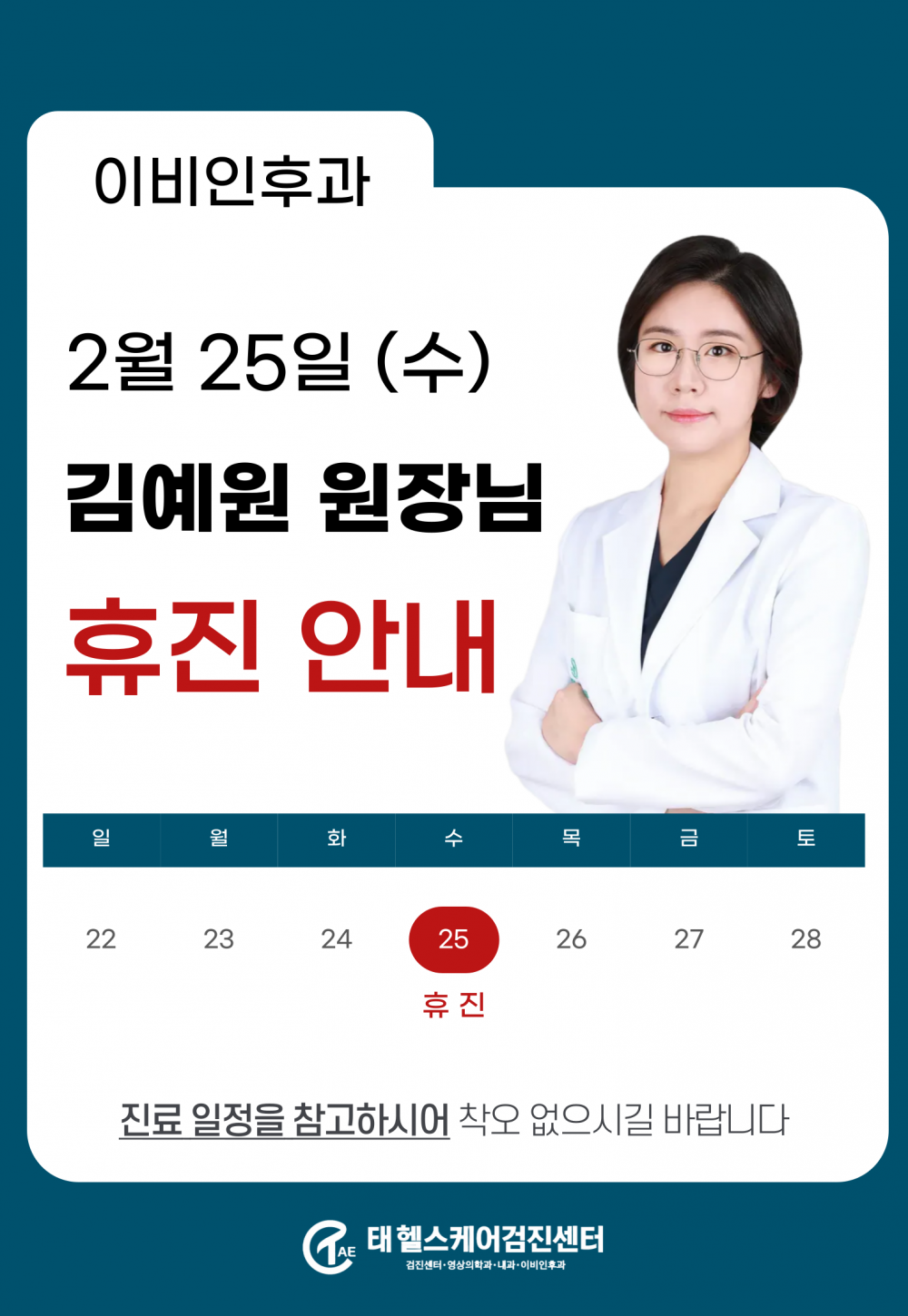 2월 25일 수요일 이비인후과(3과) 김예원 원장님 휴진입니다.